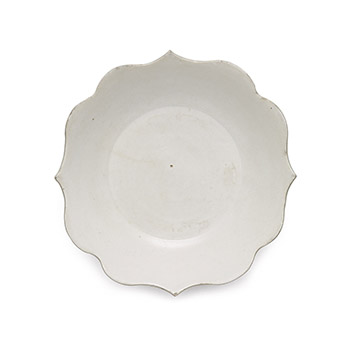 此盤四瓣菱形花口,盤口外撇,通體施白釉,圈足處露胎,釉質細膩潔白,釉色純淨,白若堆雪,器形制作規整,菱口對稱。菱形花口器形常見於五代定窯,模仿唐代時期流行的金銀器造型,此件定窯菱口盤白皙勻淨,燒造工藝講究,為五代定窯中一件不可多得的器物。
