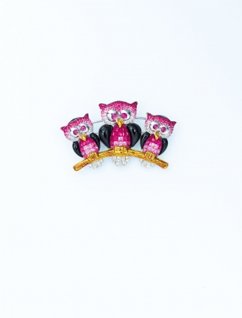 Designed as three owls perched on a branch, each with calibré-cut ruby and pink sapphire body, to the pavé-set ruby, pink sapphire and diamond head, enhanced by black onyx wings, crystal eyes and diamond tail, mounted in 18k yellow and white gold, 5.2 cm wide