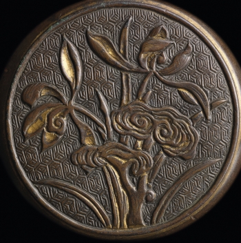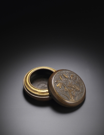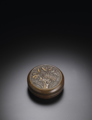 本件香盒以黃銅製成,盒身扁圓,子母口,口對接處皆起線,矮圈足,盒蓋雕以靈芝紋。盒底有“雲間胡文明製”六字篆書款。胡文明是明代萬曆年間江蘇雲間人,擅長製做銅爐及手爐,藝高工精。所製銅爐表面多裝飾山水、花卉、法器、瑞獸等圖案,並於其上鎏金,與當時明代銅爐注重素雅的風格迥異。此件作品製作精良,氣質不凡,實為難得之珍品。 D 7.8 cm.