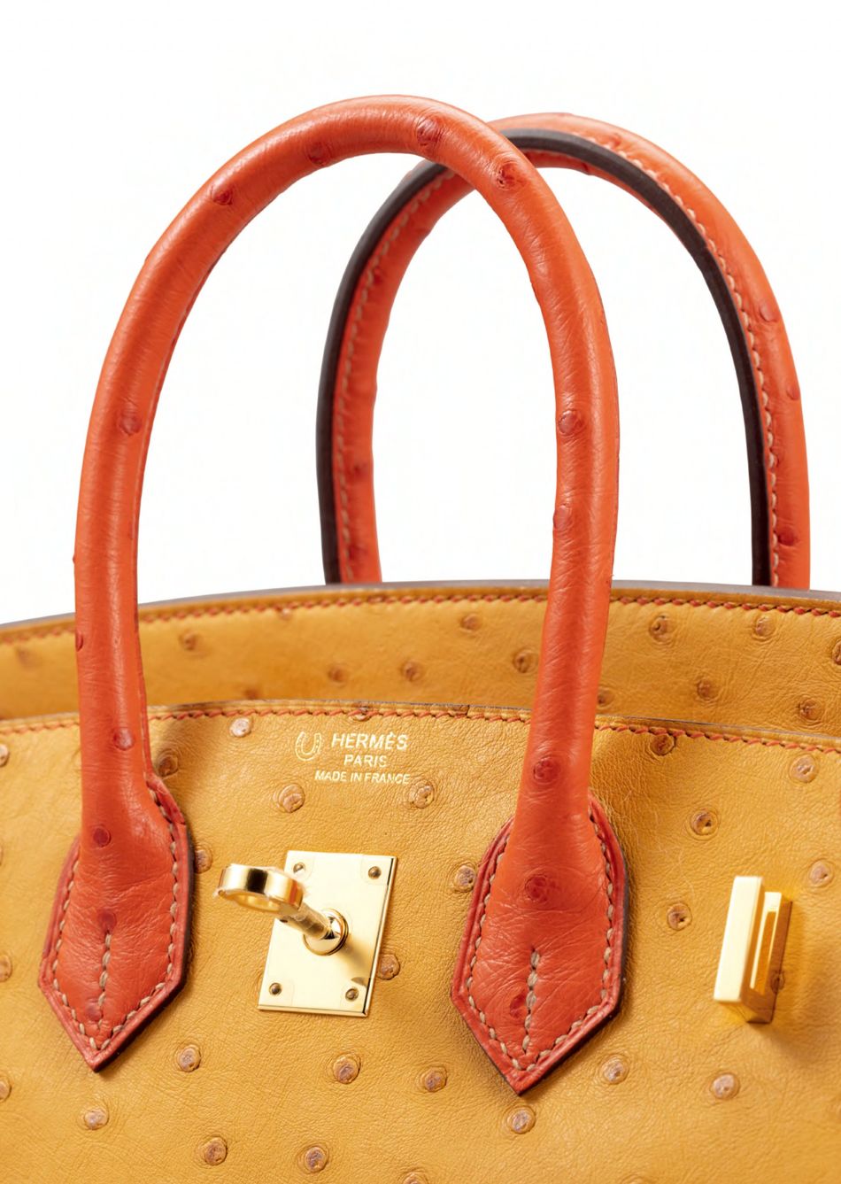 特别订制琥珀黄色及橘色OSTRICH鸵鸟皮25公分柏金包附金色金属配件
