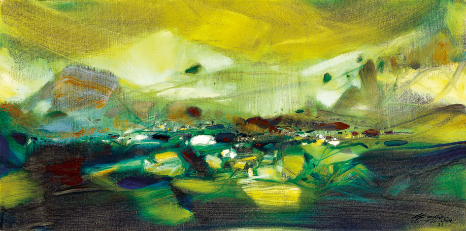 畫出性格來,使幻想變成完美無缺,很驚奇的是在他的畫面並非西方線條的透視,而從遠處看主題,出現好幾個定點,相疊相重替換著,配置在不同階度的平面上,靈活的把書法水墨詩意融會起來的那份流暢寄寓移植於畫布上,賦予色光,使畫面淋漓地耀動璀璨起來。