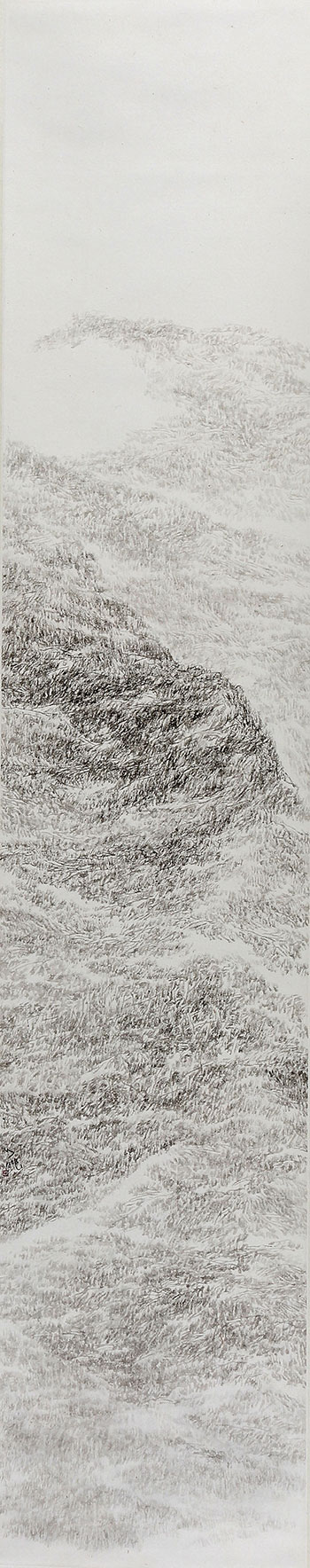 The creations of Ke's are sophisticated. The little spots with different size and contrast shown on the painting reflect the skill of ink-chapping. Together with the use of light ink, ink overnight and the humid effect on the paper, a mutation of ink-trace is composed. This connotes a change of time and climate, and one's emotion.