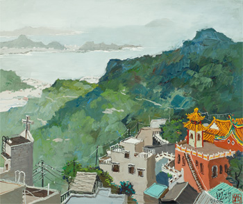 Signed on the reverse PANG JIUN in Chinese and English, titled Far View of Jioufen in Chinese