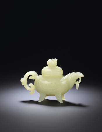 這件黃玉龍首天雞壺造型十分獨特稀有,借鑒了古青銅器“盉”的器形。天雞,是也鳳的別稱。此壺整體如圓雕之鳳,蓋頂端坐壹尊鳳雛。龍是皇權的象徵。此壺以龍首為流,上結兩條綬帶,十分罕見。龍口下方配以活環,遠觀似鳳首。壺口一圈飾雲肩如意紋。壺體兩側取自商周古玉中的神鳥圖案。壺柄參照古玉器形制,形似鳳尾。線條優美的四足上是典型的古代青銅器紋飾。這件作品運用浮雕、透雕、圓雕及挖空多種工藝手法,雕刻出這件高貴清雅,巧奪天工的佳作。此壺集龍鳳於一體,意為陰陽調和,龍鳳呈祥。