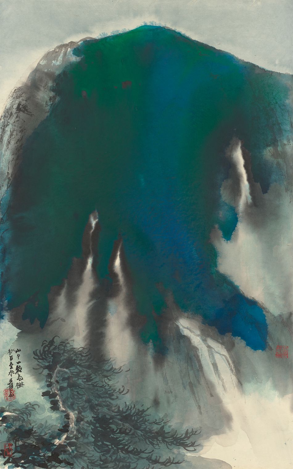 本作題畫詩「山中一夜雨,樹杪百重泉」描繪夜雨傾瀉,穿透林梢,有如百泉而下。本作構圖由上而下展開,以大面積青綠潑彩覆於山體之上,色澤濃潤,氤氳蒸騰,宛如驟雨傾瀉。前景樹林以濃淡筆觸點出,煙嵐於潑墨與潑彩之間相互滲化,畫面與詩詞相映成境。