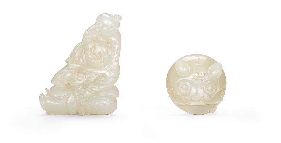 清 白玉摔跤童子及虎面帽镇(两件一组)