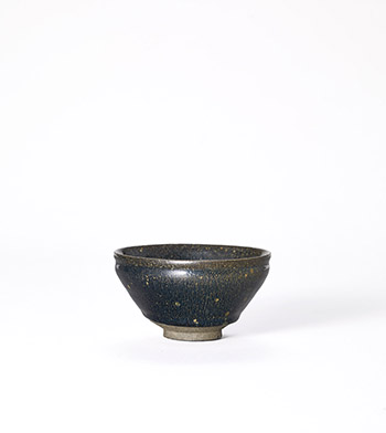 此兔毫碗,胎骨厚重,胎色黛黑,盞斜壁微弧,小圈足。盞裡施滿釉,盞外施釉不到底,露胎處呈褐色。腹下部釉垂流形成滴珠狀。口下釉色呈黃褐色,漸為褐黑相間,盞裡心為純黑色。內外黑釉面上帶黃色條縷絲紋,類似野兔毛毫,故名「兔毫紋」。紋理清晰,毫絲分散、且直且長,符合優秀兔毫的所有標准。器型為建窯最經典的造型,束口邊止溢線清晰、有張力。由於宋代建窯兔毫盞名氣很大,所以一些宋代文人對它多有贊美之辭,如北宋蔡襄《茶錄》載:「茶色白,宜黑盞,建安所造者紺黑紋如兔毫,其坯微厚,繼之久,熱難冷,最為妥用,出他處者皆不及也」。由此可見本物實為不可多得的一件宋建窯之佳作逸品。
