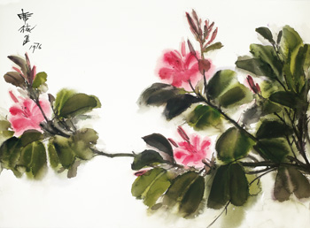 In “I Paint, I Think, I Speak”, Shiy De-jinn speaks of painting flowers: “To take the subtly of ink and transform it into subtly in color I had to come up with a new method of coloring. I would consider the problem deeply before making the layout and setting up the space. One should not take the automated movements of ink painting and use them in color like some trick, instead one should use a careful and firm brush stroke to reach the inner meaning of the subject.” Here in Shiy’s “Bauchinia,” though made in color, still contains much of the subtly of traditional ink paintings. It is a genuine and skilled work, mixing aspects of the traditional with the modern, and is a strong representation of Shiy’s style in watercolor.