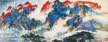 繪於1987年彩墨作品《憶寫黃山天海一線天》,即是畫家在這個時期進行彩墨藝術探索的代表例證。畫面中群峰聳立,層層疊嶂,氣勢撼人,雲霧蒸騰,似仙境一般令折服於大自然的天作之功和造化之力。遠處山巒之影,以朱砂相敷,漸近石峰以水墨加以潑彩,在彩墨的自由滲化之間,施以多次積墨,並以石青渲染其中。前景的神奇蒼松,依託遒勁筆線勾勒而成。大片的墨色與水交合,在宣紙上留下了豐富的肌理效果。留白和著色的面積對比,使得紅與藍的色彩聯繫既強烈又入調,達到了沈穩厚重而靈動飄逸的高古境界。