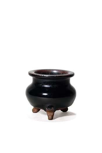 此爐唇口,直頸,鼓腹,下承三足,器物內外皆施黑釉,器物邊緣釉薄處略顯鐵銹色。釉水在燒制的過程中流動,所以呈現器身口部、頸部略薄,底部較厚。此種器形為宋金代時期香爐的流行造型,亦有鈞窯香爐類似器形可做參照。H: 6.5 cm