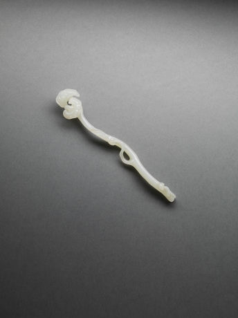Of carved as a semi-translucent ruyi of pale celadon color, carving approximately 15.1 cm long