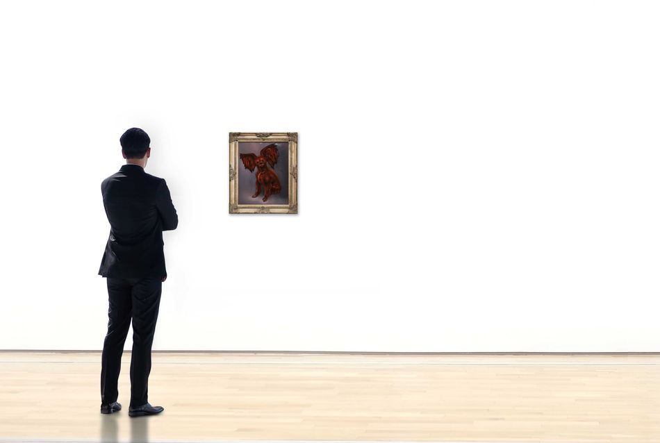 本次徵集的靜物畫系列《福蝶》,運用古典油畫技法,在小尺幅畫布上透過置中的構圖與對稱平衡,刻意淡化空間深度與透視的追求。主體被安置於最接近觀者的位置,使其與周圍留白之間產生緊密的關係,構成一種節奏分明的視覺韻律。儘管畫面中未使用強烈光影營造戲劇性,主體與背景之間仍透過細緻而克制的調性處理,營造出如同舞台般的靜謐又華麗的氛圍。