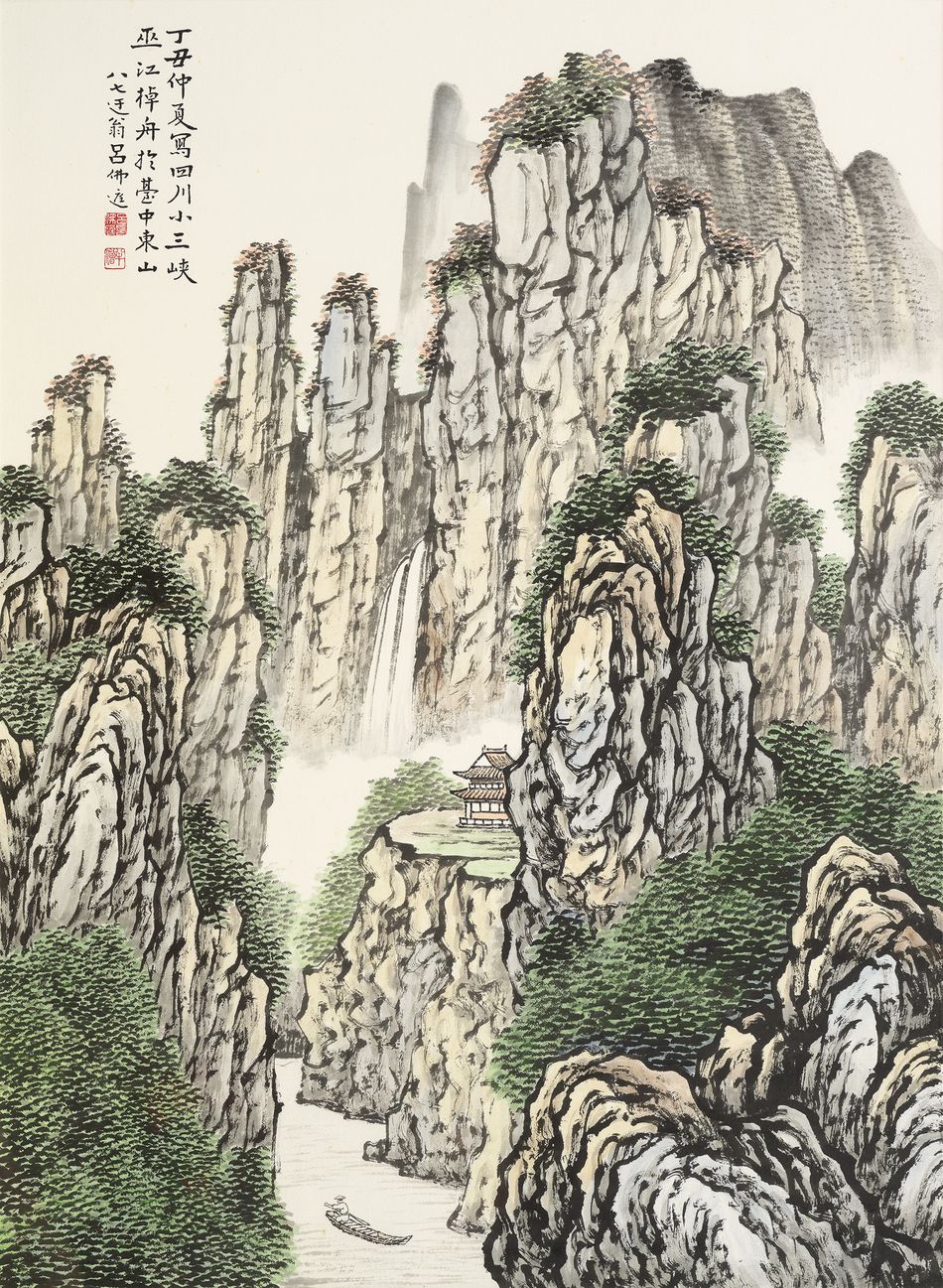 款识:丁丑仲夏,写四川小三峡巫江棹舟于台中东山,八七迂翁吕佛庭。
