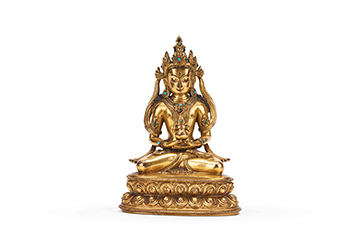 此尊無量壽佛著菩薩裝,戴菩薩寶嚴,分別為寶冠、耳璫、項鍊、瓔珞、臂釧、手鐲等。周身飾品多處鑲嵌綠松石,蓮座為橢圓形,蓮瓣飽滿挺拔,瓣尖飾卷雲紋上翹。上緣飾有細密聯珠紋。高束髮髻,餘髮披肩。寬肩細腰,身姿端正挺拔,帔帛繞過手臂於身後飄揚。下身的長裙光素無衣褶,僅以連珠紋表現衣邊。無量壽佛金剛跏趺坐姿,雙手於腹前作禪定印托甘露壽瓶。下承仰覆蓮台,蓮瓣對稱舒展,上下沿飾連珠紋,原封底鎏金。整尊造像比例刻畫準確,通體鎏金,工藝精湛,為典型的十五世紀西藏地區造像作品。