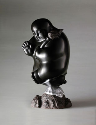 此件作品《雪峰仙蹤》完成於2007年,為李真「大氣神遊」系列的最新創作之一。李真創作從中國意境粹取,作品帶有一種「仙氣」,強調的是「遊」,以空明境界讓觀者沉澱與紓解,在精氣神內自在悠遊,用最真的態度來面對生命。就雕塑肌理與線條關係,李真表現出高超的融合性,看似簡約,但在光影下確充滿著變化,圓滿造型中依然有其精妙的神韻。左握拂塵,右推掌印,雙足交叉而立。「拂塵」在道家意涵中有拂去塵緣超凡脫俗之意,也是道門中人們外出雲遊隨身攜帶之物。仙風道骨油然而生,畫龍點睛之妙為雕塑增添神秘感。在質感上用中國墨黑色帶有霧亮處理形成特有效果,使觀者有既重又輕的感覺,銀的溫潤與黑的能量,既對比又和諧,是一件耐人尋味的精品。