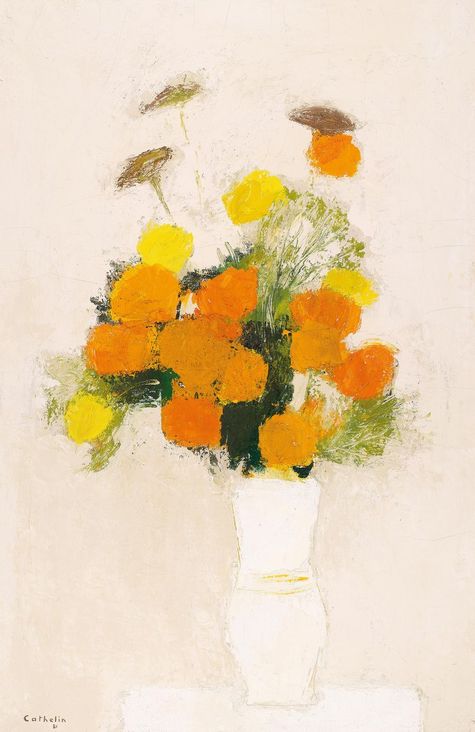 Bernard Cathelin was born in 1919 in Paris. In 1945, he was enrolled in the École Nationale Supérieure des Arts Décoratifs, and was at the same time a student in the studio of French painting master Maurice Brianchon. Cathelin adopted the strong, vivid colors of the Fauvist school and employed brilliantly contrasting tones in his own unique style. "Roses d'Inde" encompasses broad brushstrokes and a warm colour palette of sweet melodious harmony and artistic charm. It exudes extraordinary romantic nostalgia through the use of a warm palette of amber, beige, yellow and autumn greens.
