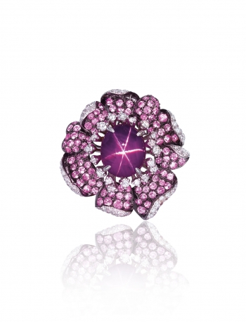 Designed as a flowerhead, centering upon a star sapphire weighing 7.56 carats with diamond pistils, to the pavé-set pink sapphire petals and brilliant-cut diamond details, to the intertwined branch band, mounted in oxidized gold, ring size 6 1⁄4