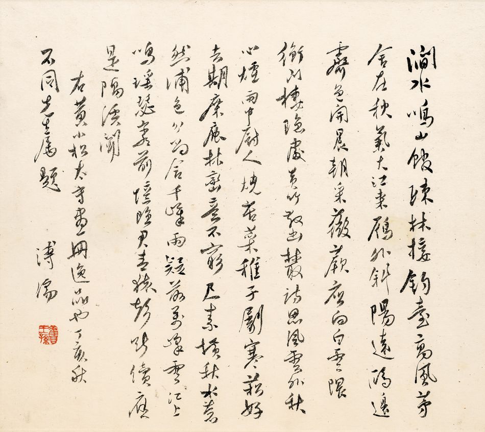 款識:右黃小松太守畫冊逸品也。丁亥秋,石同先生屬題。溥儒。