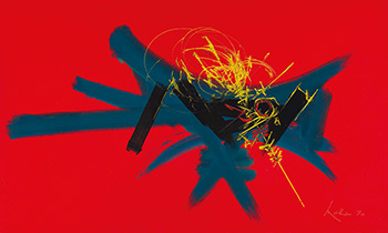 Black, white, and red are common colors of his early works. Gradually, his colors become brighter and greater in variety. His style in the 1970s was especially magnificent, though without sacrificing the noble air unique to his works. “Wise,” finished in 1970, was painted in broad strokes of indigo on vermilion, which visually extended and stabilized the composition from all sides. Thick, black lines overlap the image, while accents of bright yellow lining bring the theme into focus. Like the staff of the goddess of wisdom, a flash of lighting splits through the stormy sky. Mathieu considered the historical development of art as a series of liberations where the artist breaks free from merely copying what was seen and instead ventures forth to create works of spiritual truth. The sense of speed in his painting comes not from a thoughtless splashing of paint, but rather the artist responding to his immediate feelings, almost as if giving free reign to his rage. Mathieu’s brushwork is consistently confident and strong. His artistic process of applying paint directly from tube to canvas could be likened to fireworks bursting across the night sky. It creates a strong contrast between the base colors and line, and naturally brings the viewer’s attention to the symbolic figur es created by his use of line.