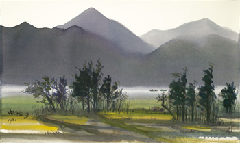 畫家以寫生展開其「發現台灣」的生命旅程,上山下鄉遊歷創作,不感倦怠。《江畔風光》是完成於1980年左右的創作,以青綠和紫色為主調,為典型席氏水彩山水畫。