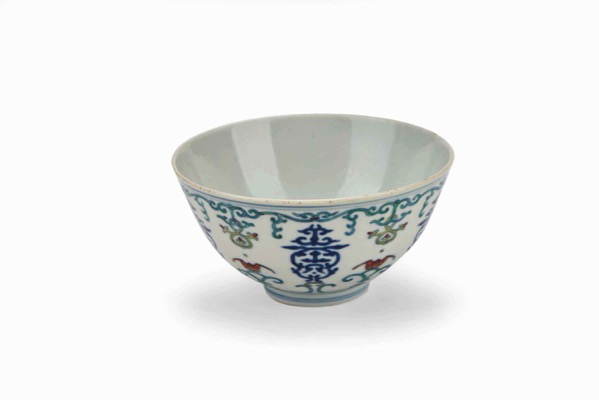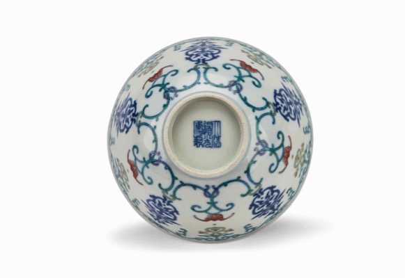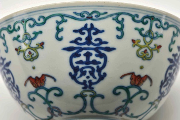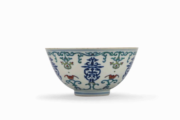 清代雍正時期,隨著圓明園的擴建,西方傳教士將巴洛克風格引入中國宮廷,出現了一批具有西方圖案特徵的瓷器品種。此式紋飾即是在這一背景下產生的,後一直延續至清代晚期。拍品敞口,深腹,腹下漸收,圈足。通體鬥彩裝飾。外壁以婉轉流暢的勾蓮組成五個篆書“壽”字紋,間以紅蝠紋相隔,寓意福壽雙全。
