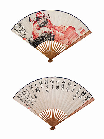 扇骨:一面刻稿构图脱胎自钱谷《午日钟馗》,一面行书,落款「玉青刻」。周玉菁(1920—2005),字玉青,为吴中名家周赤鹿长子。师从黄山泉。后一直生活在苏州地区,为近代苏派竹刻大师。