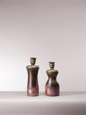 作者在柴燒的專業領域是各界有目共睹的;近十幾年來更是專研於柴燒技術,更值得一提的是,同為《人形系列—婉約》與另一作品《紅色的太陽》皆受邀參加巴黎東西方國際藝術展、羅浮宮2014中華藝術精品展、法國羅浮宮Carrousel卡洛斯廳展出,將台灣陶瓷藝術呈現於國際藝術殿堂,實為不易,堪稱「台灣之光」!此次拍品《人型系列—佳偶》,以柴燒燒製而成,作者以成熟的拉坏技巧,一氣呵成後再意象塑型。由於作者感嘆現今離婚率增高,怨偶頻增,祈願人間多能成就「對對佳偶」,起念多些正面能量,皆以和諧、相敬、尊重、互持角度對待,豈不「佳偶天成、成太平盛世」。此外從另一角度來看,中國神話故事中,女媧以泥塑造人更能合乎本意!