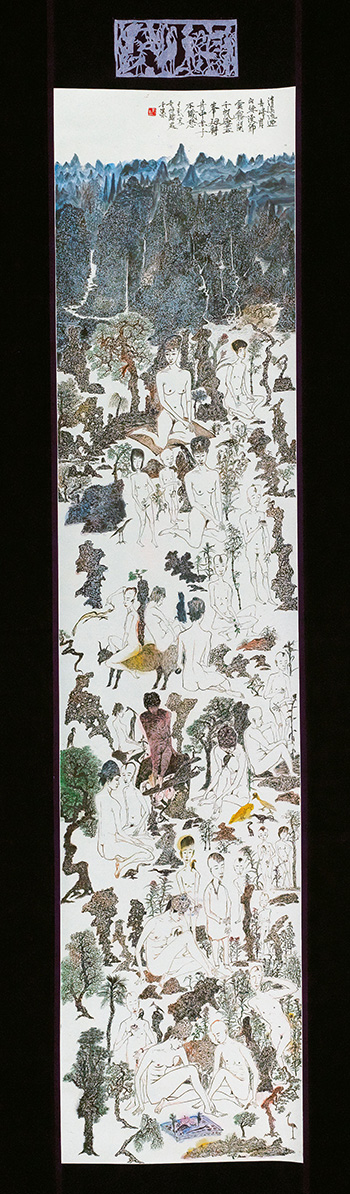 《奇峰歸處千瀑》曾在1998年於紐約懷古堂展出,其畫面豐饒緊湊,山水中醞釀許多騷動。人物與古樹貫穿全作,裸露的男女老少線條簡練,或坐或站,神態不一,呈現畫面上樸實又幻化的氛圍與怪誕性,彷彿隱匿著無數似真似幻的傳說。中國造園手法中,其中「因景設路,因路得景」,景色與路徑相互演繹,于彭創新的路景佈局,令觀者更引頸探究作品中人物與自然的關係。