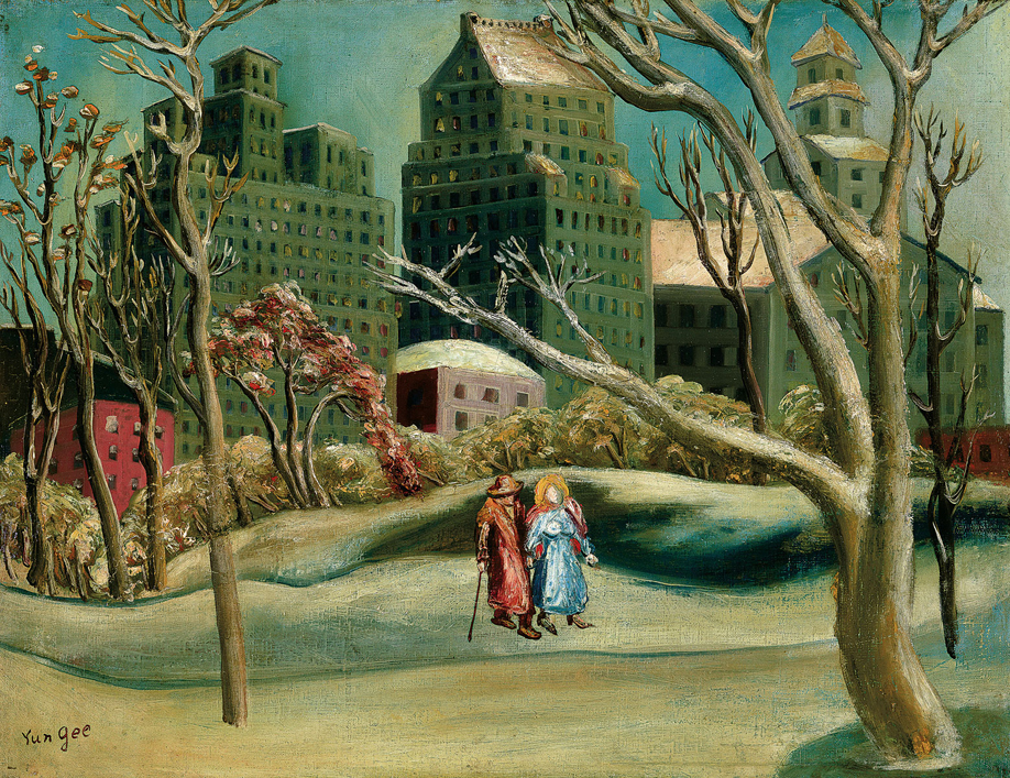 本拍品《中央公園冬景》作於1940年左右,朱沅芷剛從巴黎返回紐約之際。當時他曾住在曼哈頓東67街,靠近麥迪遜大道交口,為期約半年。後來因無力負擔房租,搬遷至格林威治(Greenwich Village)。居住上東期間,常與當時交往5年的女友海倫(Helen Wimmer, 1919-2004)相偕中央公園散步。這段時間他繪了幾幅中央公園寫生圖畫。兩人於1942年結縭,隔年生下女兒朱禮銀。此時他積極創作,舉辦畫展藉以捐助戰爭的中國孤兒,創作力旺盛。就畫風而言,《中央公園冬景》屬於為第二次紐約時期,個人風格十分成熟,延伸巴黎時期和諧、感性色調,但陰暗對比強烈,更顯深沈憂鬱。畫中背景高樓聳立,幾何狀的建築,光亮與陰暗對比強烈,顯示都會的現實冷峻;前景幾株光禿枝幹張揚,分割面空間,與後方的高樓相映襯,中景林木染上霜紅,紅男綠女裹著厚重大衣,並肩閒適散步,為蕭瑟的城市風景增添幾分暖意。《中央公園冬景》,反映了藝術家受現實所迫,但幸有愛情為伴的心境,整體作品色彩和諧、結構緊湊,為紐約時期難得一見的佳作。