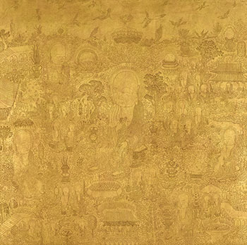 曾揚從2013年至今,在純金箔上繪制的西方極樂世界圖,即《無量壽世界》系列。這一系列的作品由許多小的佛教中的物象構成,那是一個存在於我們這個世界空間維度之外的,能讓人忘掉現實痛苦,彷彿虛擬著又令人嚮往又亦真亦幻的世界,是一個通往永恒之門的美好之境。《無量壽世界》正是通向這一過程的中轉站,那裏沒有苦,只有樂。那裏黃金鉆石用來鋪設道路,到處都是一片祥和之氣。宮殿房屋都是七寶所做。景色美不可及,水鳥皆流法音,令人開神悅體。沒有寒暑代謝,沒有老病相催。那裏沒有士農工商。只有教學相長。那裏人壽命無量,學無止境,最終通向無量永恒。正如曾揚所言:「希望這個系列能讓人看了產生歡喜心,產生向往極樂的願心」。
