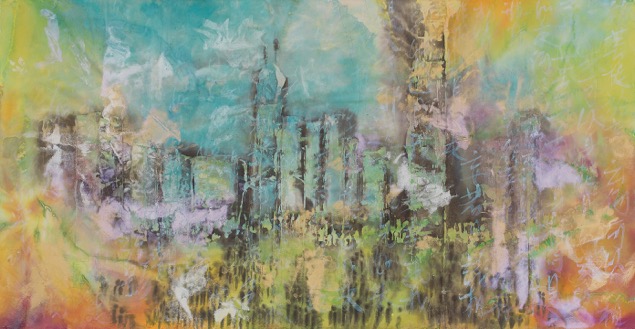 作品《心灵之赞颂》从远处看,会看见第一层的颜色和抽象形态;可是靠近一点,就可以看到背后不同层次
