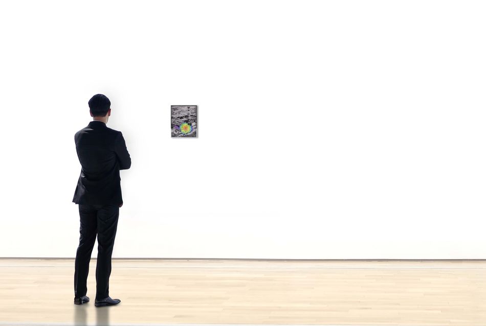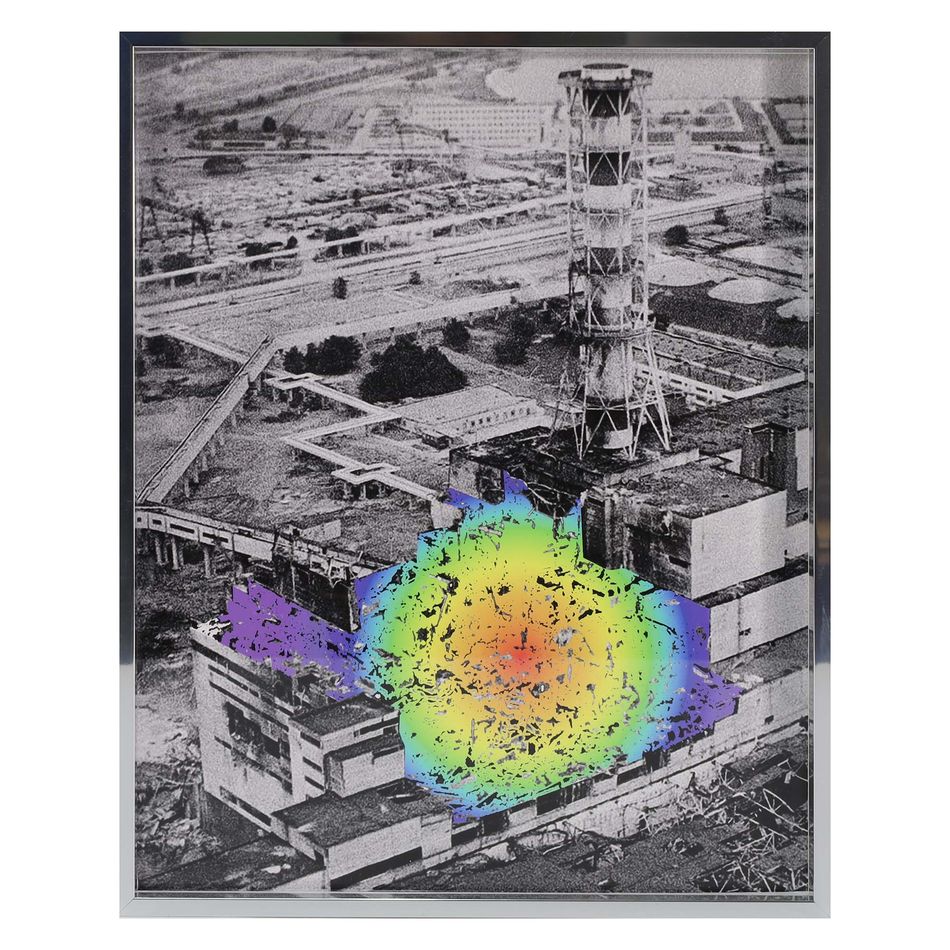 《起源-彩虹》將車諾比核電廠爆炸後的照片進行數位處理,因爆炸而殘缺的建物部分被草率移除,並被漸層同心圓彩虹荒謬而歡愉填滿。