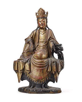觀音頭戴化佛冠,額際方圓,雙頰豐腴,眼瞼低垂。耳側髮辮搭肩,頸部飾有珍珠項鍊。端莊慈祥,頗極丰姿,氣質高雅。觀音上身穿袈裟,下身著長裙,遊戲坐於山石之上。衣襟飄逸靈動,保存完好。左臂倚靠几座,右手自然垂放於右膝,端莊閒適。裙擺從台座垂下,波浪紋的裙褶婉轉自然。