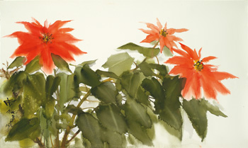 Flowers and mountains are the two most important themes in Shiy De-jinn’s watercolors; for his flowers, Shiy chose primarily from the most common of Taiwan-indigenous flowers. Christmas flowers are one such subject. Here in “Christmas Flowers” Shiy’s use of line is extremely subtle, which stresses his rendering of color and produces the entire mood of the work. Shiy is very comfortable with Western techniques and spirit, and in his later work these became innovative, revolutionary elements in Chinese painting. His watercolor paintings incorporate techniques specific to oil, watercolor, ink, and sketching. Further, it even uses the brush strokes and force he learned from Chinese calligraphy. These changes brought a revolutionary new vision to watercolors, which is one of the reasons Shiy’s watercolors are so highly praised for their value and achievement.