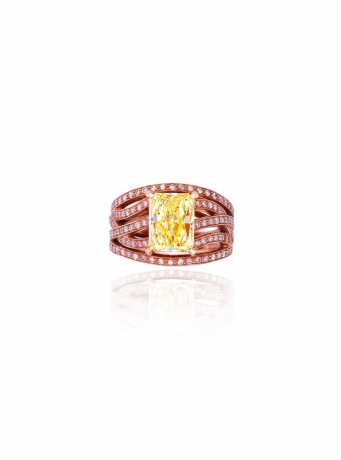 Set with a VS2 modified rectangular-shaped fancy intense yellow diamond weighing 3.02 carats, to the brilliant-cut pink diamond openwork half-hoop, mounted in 18k pink gold, ring size 6 3⁄4
