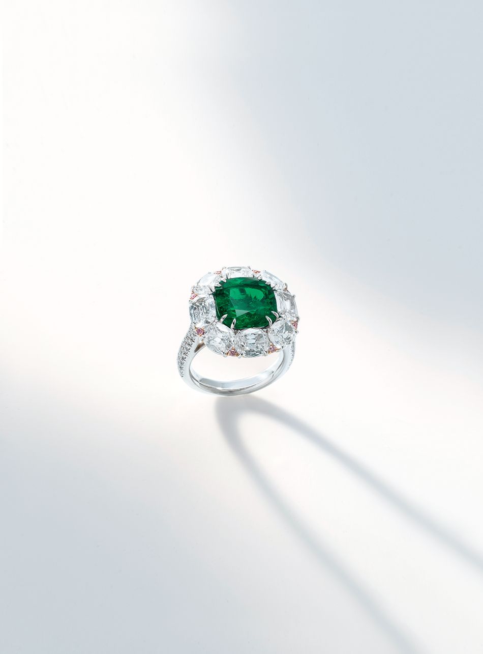 A 4.55 CARAT COLOMBIAN EMERALD AND PINK DIAMOND RING, from Muzo mine with no indications of clarity modification.