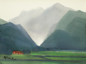 畫家以寫生展開其「發現台灣」的生命旅程,上山下鄉遊歷創作,不感倦怠。《山中古厝》是完成於1980年左右的創作,以青綠和紫色為主調。畫中描繪高山原野,有三兩老屋座落其間,悠閒靜謐,綠意盎然。
