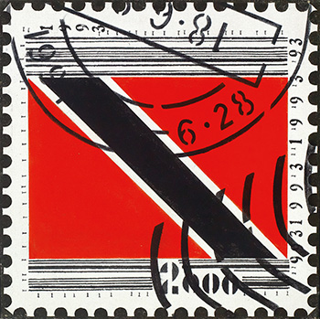 「(國旗)是代表那個國家人民的視覺最簡約、公定的圖式,意義圖騰的視覺最佳選擇—最抽象的意義符號,由此也對應了康定斯基、馬列維奇、萊因哈特的視覺學科本身的工作。這樣,意義和圖形本身都被消融而化為合一狀態,兩者不可分離。這樣,它既是意義又是圖形而不被分離所誤解。這就構成了符號,而當把這些符號集郵時,預示著多元的匯流與新的整合;條碼提供視覺的流通感,在流通線中的國旗將被分解;1234567890是工整符號,與它相比任何國家文字都不公正;2000是指待目的,人們心中的一種期待—世紀末的新可能性意指。」(任戩1991年「集郵系列」創作自述)