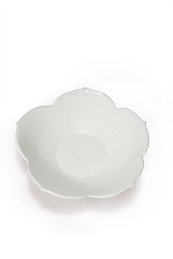 此洗五瓣菱形花口,腹部微斜,洗口流釉如淚,通體施白釉,圈足處露胎,釉質細膩潔白。釉色純淨,白若堆雪。菱形花口器形常見於五代定窯,多為四瓣,而此洗為五瓣,更為稀少,器形模仿於唐代時期流行的金銀器物。此件定窯早期小洗釉色白皙勻淨,燒造工藝講究,為五代定窯不可多得的一件雅器。