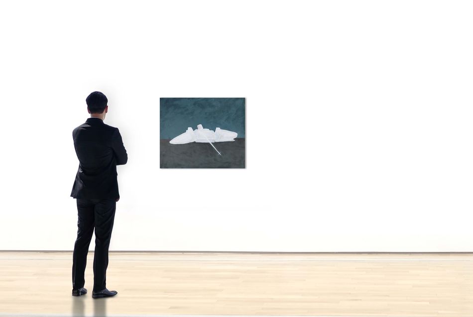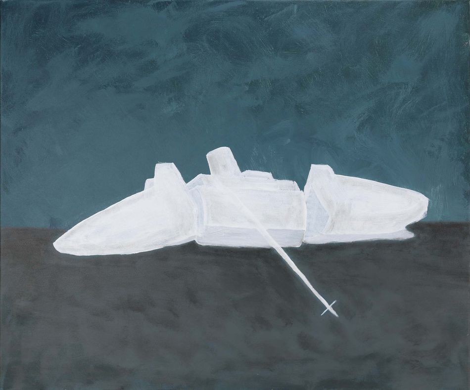 藍仲軒(b. 1991)生於台灣台北,紐約普瑞特純藝術學系藝術創作碩士。他的作品取材戰爭、災難、歷史及航太,透過重製攝影、現成影像、文獻影像、歷史物件成影像或複合媒材裝置,討論生命與身份的普世與可能性。近年展覽包括土耳其伊斯坦堡「中介雙年展」(2023)、台北也趣藝廊個展「αβγθ」(2023)、台灣台中窯座個展「大海之所以浪漫是因為它沒溺死你」(2023)、台中國立臺灣美術館聯展「覆寫真實:臺灣當代攝影中的檔案與認同」(2022)、韓國水原「水原國際藝術節」(2022)、德國萊比錫AKI Gallery Leipzig Prospect個展「餘溫」(2021)等。近期策展包括日本東京Gallery COMMON聯展「IMAGRATION」(2023)、台北關渡美術館聯展「挑釁世界—對中心主義的反抗」(2021,共同策展)。曾參加日本3331 Arts Chiyoda與芬蘭Arteles Creative Center駐村計畫,獲獎包括Arte Laguna Prize、集保當代藝術賞、文化部MIT新人推薦特區等,作品獲集中保管結算所、藝術銀行、新光三越文教基金會等機構典藏。 繪畫作品《海葬》呈現了一艘沈船殘骸,白色船身暗示因戰爭而被擊沈的德國救援船威廉古斯塔夫號,也透露此沉沒事件的被遺忘與被省略(人類史上傷亡人數最高的海難)。個人在災難數據之下成為了整體,而此繪畫吐露著對生命消逝的情感狀態。