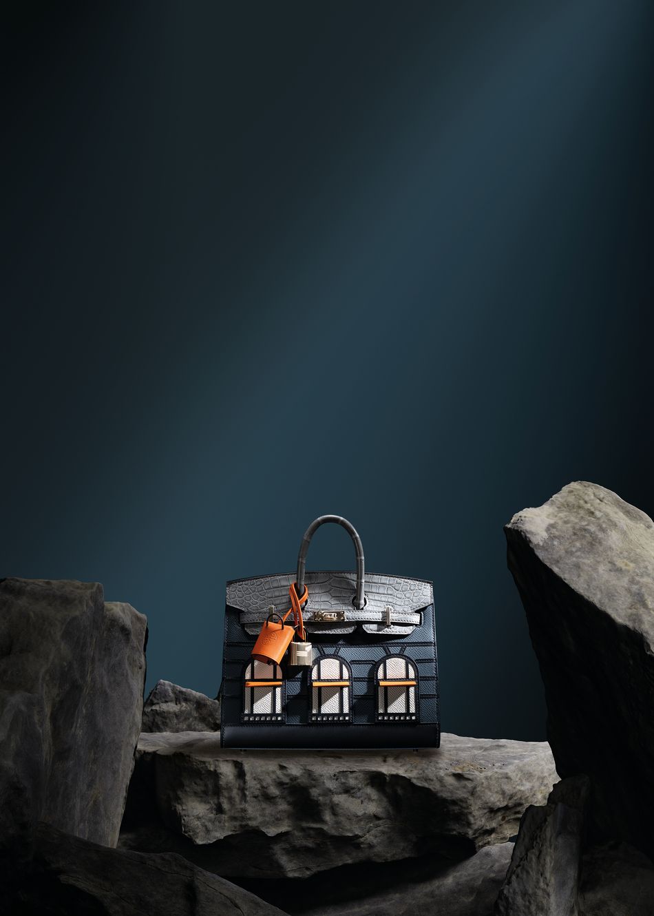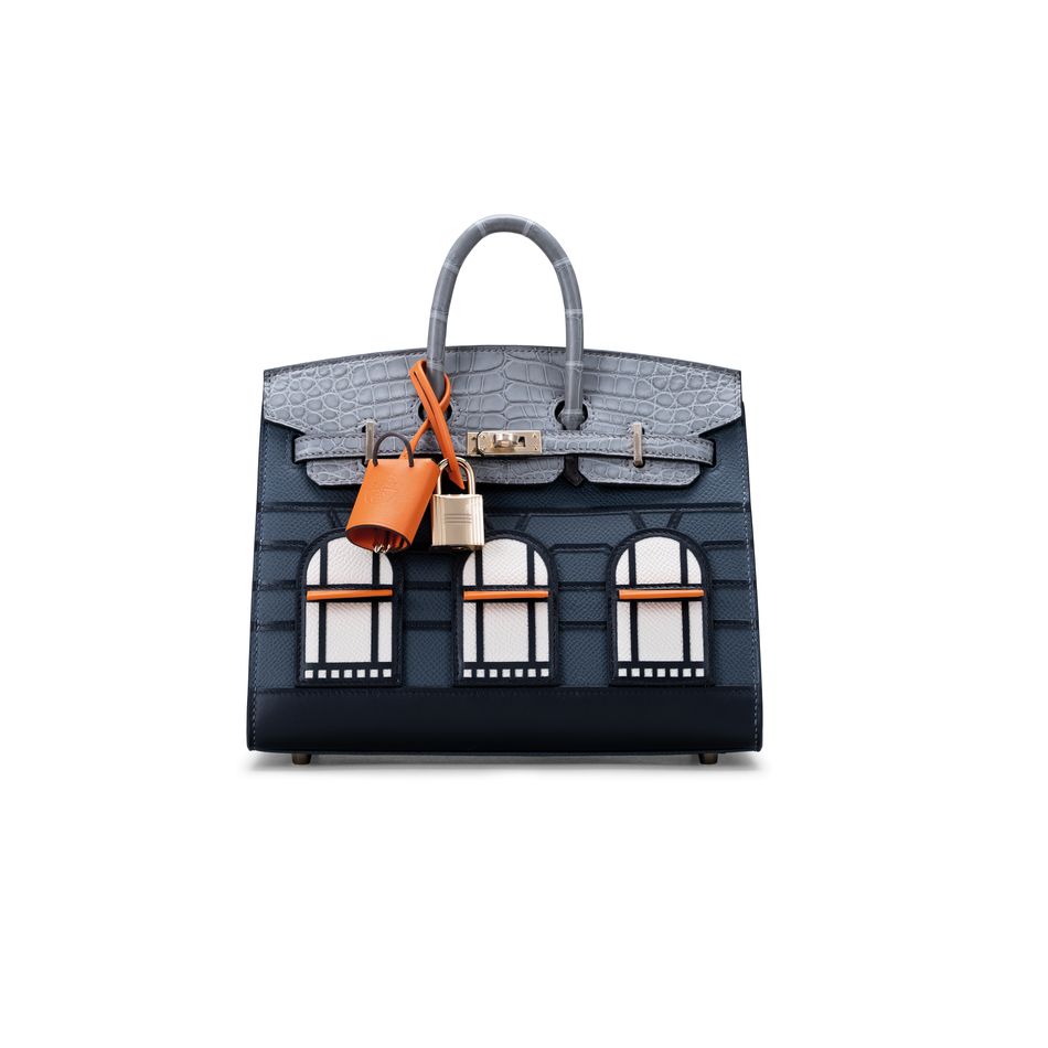 罕見霧面水晶灰色短吻鱷皮, 霧霾灰色及奶昔白色EPSOM, 橙色及黑色SWIFT牛皮20公分外縫煙雨FAUBOURG外縫柏金包附淡金色金屬配件
