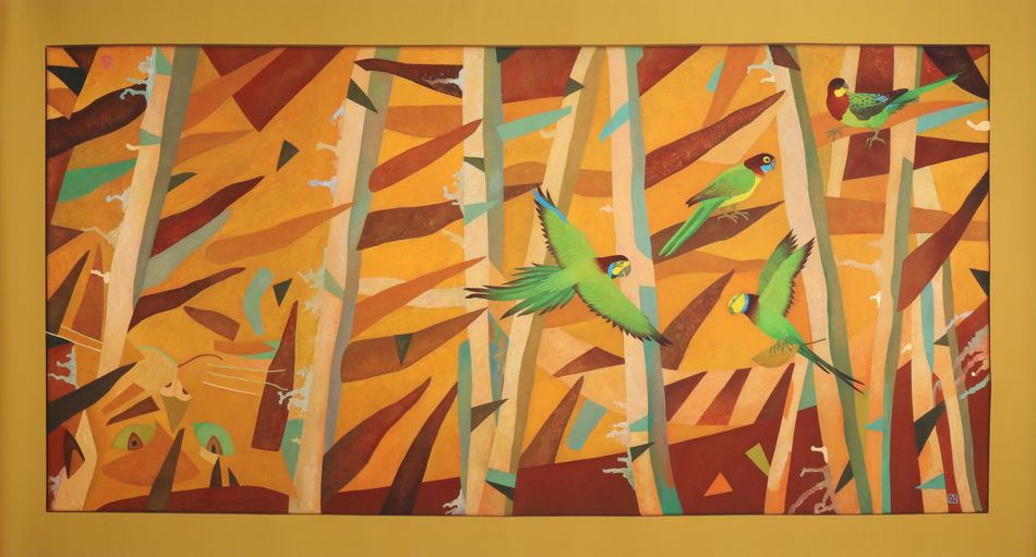 俄羅斯藝術家安娜.紐格鮑爾精於繪畫及插畫創作,曾或許多相關獎項,現創作生活於奧地利。受到現代主義與象徵主義的影響,其富有濃厚俄羅斯情調的多樣創作風格,成為藝術家鮮明的個人美學。紐格鮑爾曾於2015年與法國最知名的兒童繪本出版商合作繪本《VASELISA THE BAUTIFUL》,此書在同年也獲國際權威媒體《紐約時報》報導。 本拍場拍品《鸚鵡與貓》,藝術家以純熟的構圖技巧使整鸚鵡嬉戲的橘貓精妙地融入了林景,極度平面的幾何則營造出斑紋和樹林交錯間深淺有致的空間感,讓活潑律動的畫面同時蘊含著藝術家對畫面布局縝密的構思軌跡。