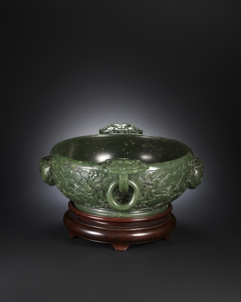 整器通體以碧玉雕成,造型壯碩,正圓深腹,口緣光素內歛,圓形圈足,通體浮雕蟠桃蝙蝠紋飾。此器內部掏空,壁厚外鼓,兩側雕如意雲頭紋雙耳,如意頭上裝飾蟠桃蝙蝠,有一長柄接於腹部,內套活環,腹部外側淺浮雕連續蟠桃枝葉圖案,蝙蝠展翅飛翔其中,下方還有整圈的崖石海水紋飾,器壁前後方裝飾半圓雕的巨型蟠桃,蟠桃上都有張翅蝙蝠的細節,襯托出鮮明的題,寓意「福壽連綿」的吉祥意義。 本品造型莊重大方,紋飾規整,布局對稱。在裝飾手法上採用浮雕、立雕、鏤空雕等複雜組合工藝。最特別的一點,是本件與現展覽於北京故宮博物院〈盛世琳瑯-院藏乾隆朝玉器精品展〉的一件碧玉活環洗,除細部花紋略有不同,質材、尺寸、器型、裝飾上均極為相似,應出於同一宮廷作坊。