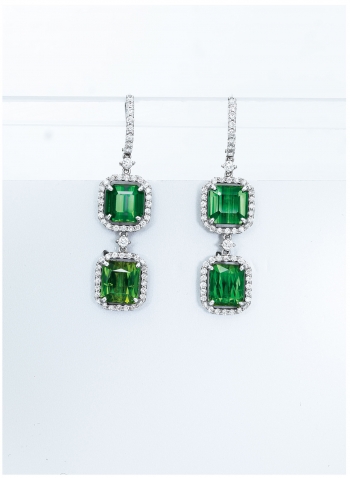 Comprising a pendant, set with a line of two square-shaped green tourmalines each within a brilliant-cut diamond frame, spaced by diamond collets to the brilliant-cut diamond line top; a pair of ear pendants and ring en suite, mounted in 14k white gold, pendant 4.0 cm long, ear pendants 4.5 cm long, ring size 6 3⁄4