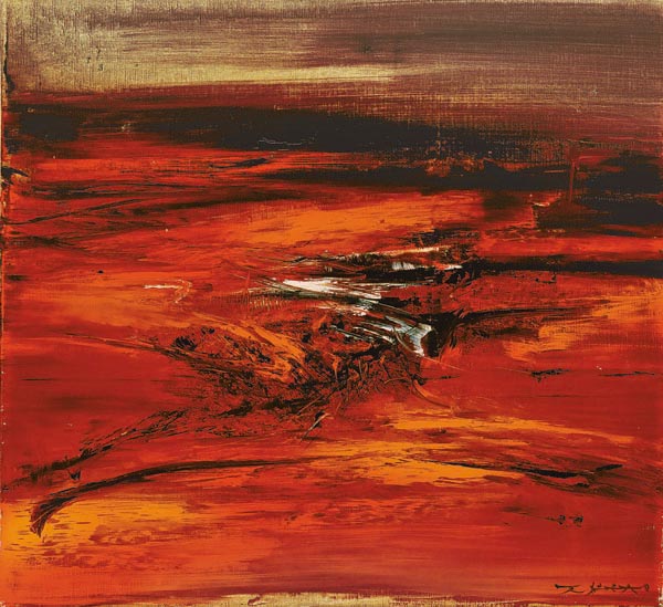 早期赵无极的抽象画从学习克利(Paul Klee)的神祕诗意,到凝聚甲骨文式符号,一直在抽象画的道路上探索。1958年后扬弃了符号,转而从不同色调的组合,发掘心灵空间的深度。他寻求透过色彩与线条表现内在的情感,而后来其颤动的线条笔触愈来愈接近隶书或狂草书的动势。作品《31.3.63》完成于1963年春季,褐红色的天地里画家的思绪随笔锋昂扬,快意挥洒自信酣畅,光芒从画中绽放,这幅作品展现了1960年代赵无极的深邃华丽风格。