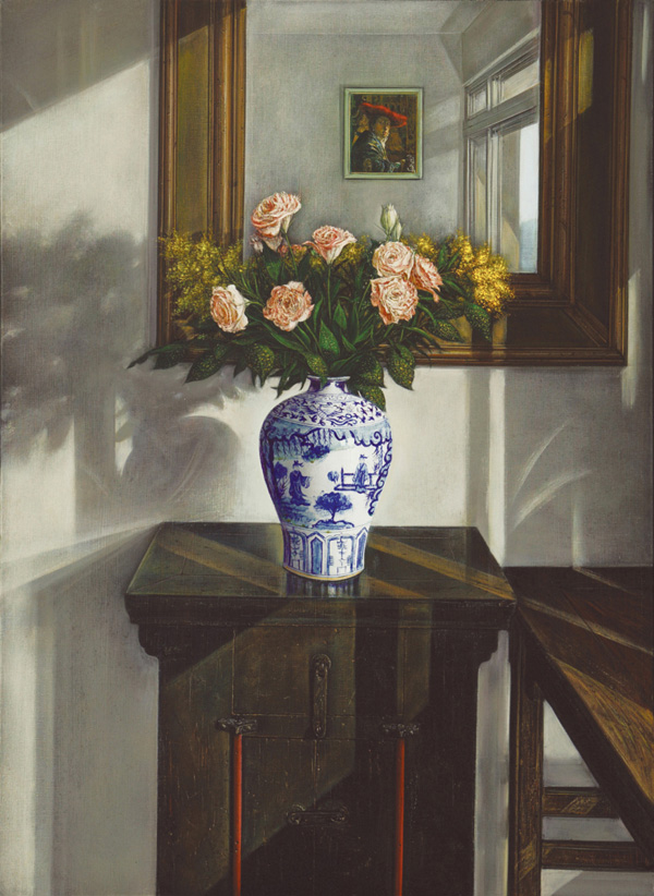 春日午後,晴好的陽光斜照進畫室,朋友贈送的一束鮮花,盛開在青花梅瓶中,使得古意盎然的明式傢俱都鮮活起來。花影扶疏映於牆壁,更有明鏡返照投入,又從鏡中返照出室外天光。如此明亮、唯美、安靜的畫面,也正是我向最心儀的荷蘭畫家維梅爾致敬的靜物畫作。 (黃銘昌 創作自述)