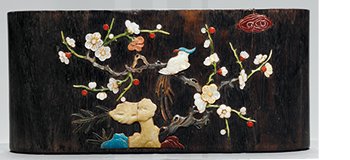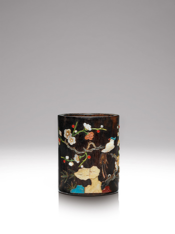 This cylindrical brush pot is carved from zitan. The exterior has been inlaid with precious materials – including mother-of-pearl, ivory, coral, agate and jade – over a carved preliminary sketch to create a colorful picture of birds in plum trees and bamboo. The picture is neatly and simply executed, well-composed and full of life. The positioning of the birds on the plum branches has auspicious connotations.