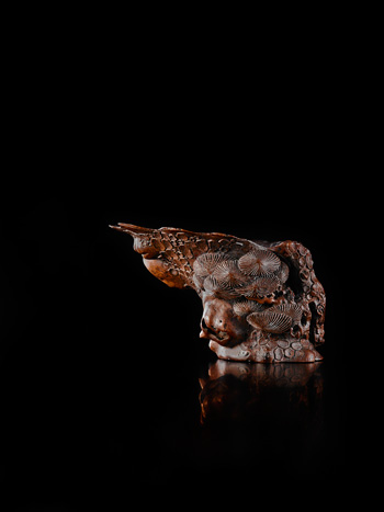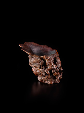 The cup is of irregular shape naturalistically carved in high relief in simulation of a section of a pine trunk, detailed with nodules imitating tree bark and carved in openwork with growing pine on extended gnarled branches, the well-hollowed interior of the cup left plain.