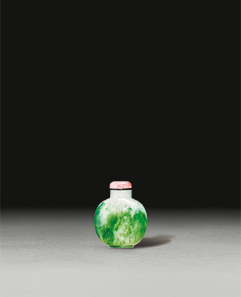 A FINE AND RARE MOTTLED EMERALD-GREEN JADEITE SNUFF BOTTLE <br/>1770-1850 QING DYNASTY