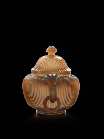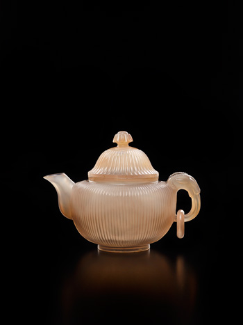 整料冰糖瑪瑙雕成,通體薄胎。壺蓋為半球狀,圜頂,頂上浮雕雛菊朵花為鈕。壺體似球形,腹壁滿飾直筋狀菊瓣紋,壺嘴光素,壺把作羊首銜環,圈足。是件執壺造型優美,整體裝飾紋樣繁中有序,壺把設計新穎獨特,是痕都斯坦玉作風格中的難得精品。